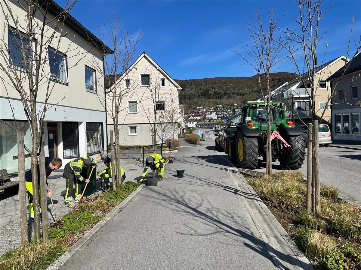 Grøntområda skal også få seg ei våropprydding. Bed i Kjøpmannsgata vert denne veka stella til etter vinteren. I dei komande vekene skal dei store krukkene rundt om i sentrum beplantast med uvurderleg arbeidskraft frå karane i Hafest.
