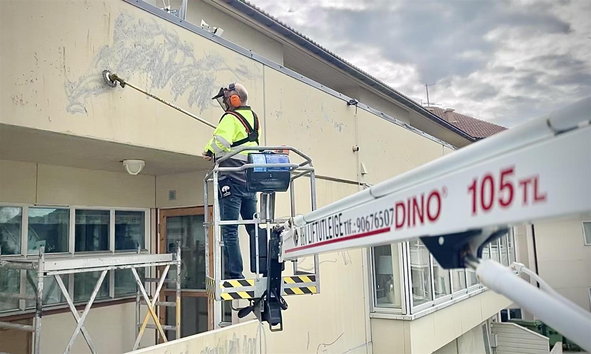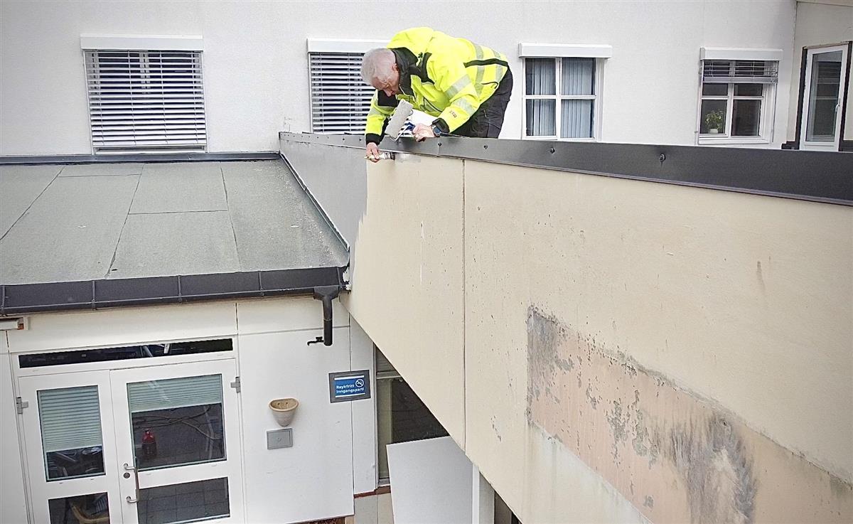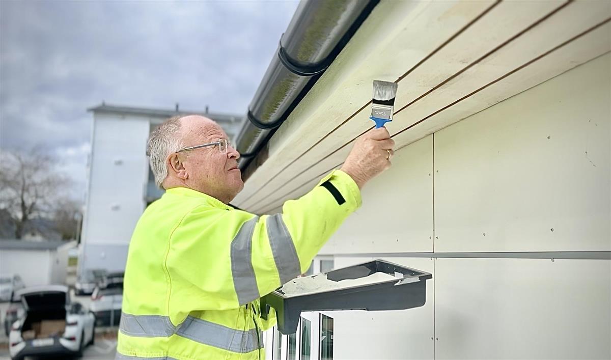 – Vi nyttar finveret og reknar med å bli ferdige i løpet av veka. Det gjeld å få det unna så raskt som mogleg, slik at vi slepp å ha stilas og lift ståande lenge. Åtte ivrige pensjonistar i full innsats, smiler Grimstad.