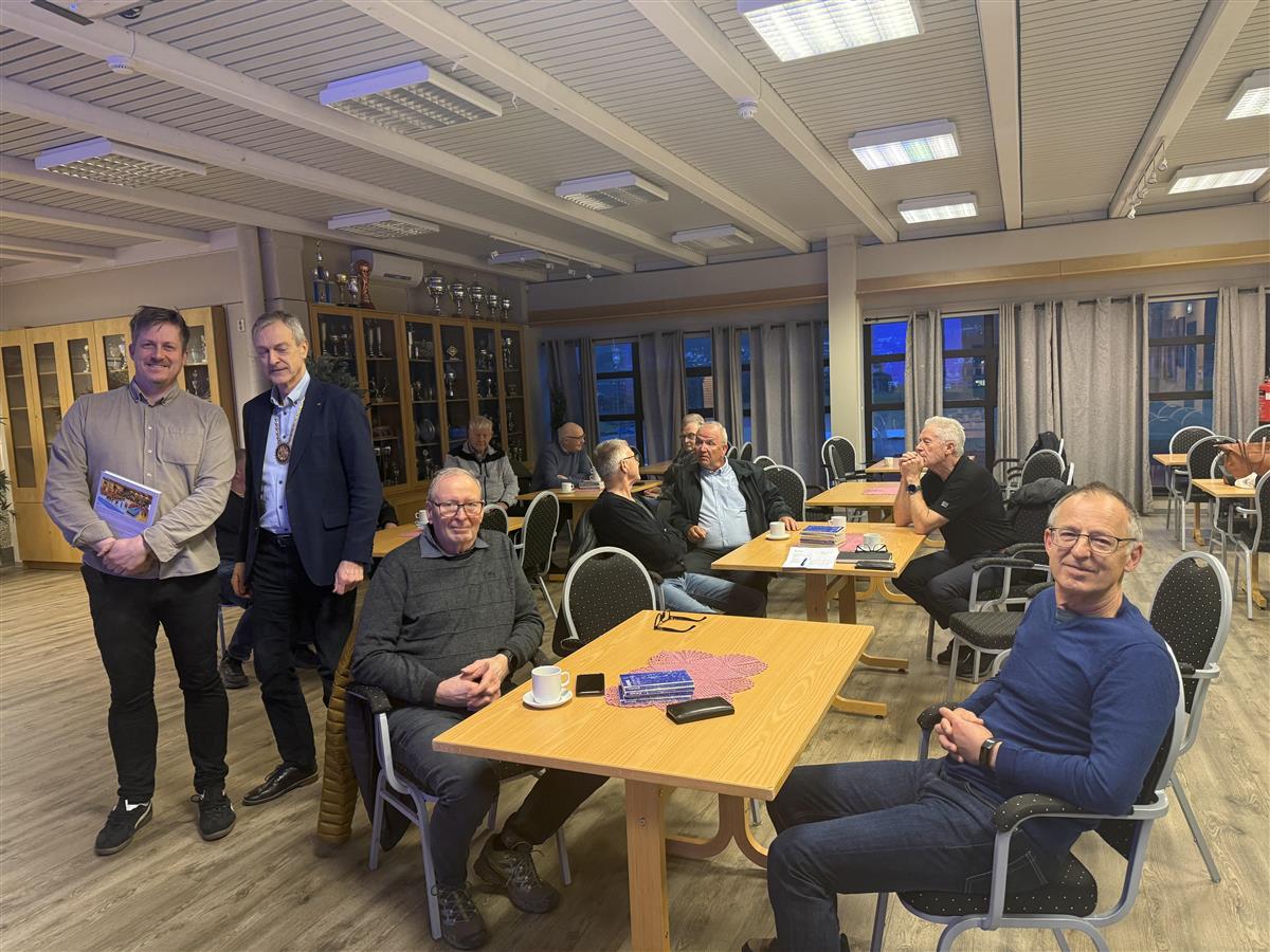 Beredskapsrådgivar Erlend Friestad saman med president i Hareid Rotaryklubb, Karl Johan Bakken - i tillegg til dei møtande medlemmane i Hareid Rotaryklubb.