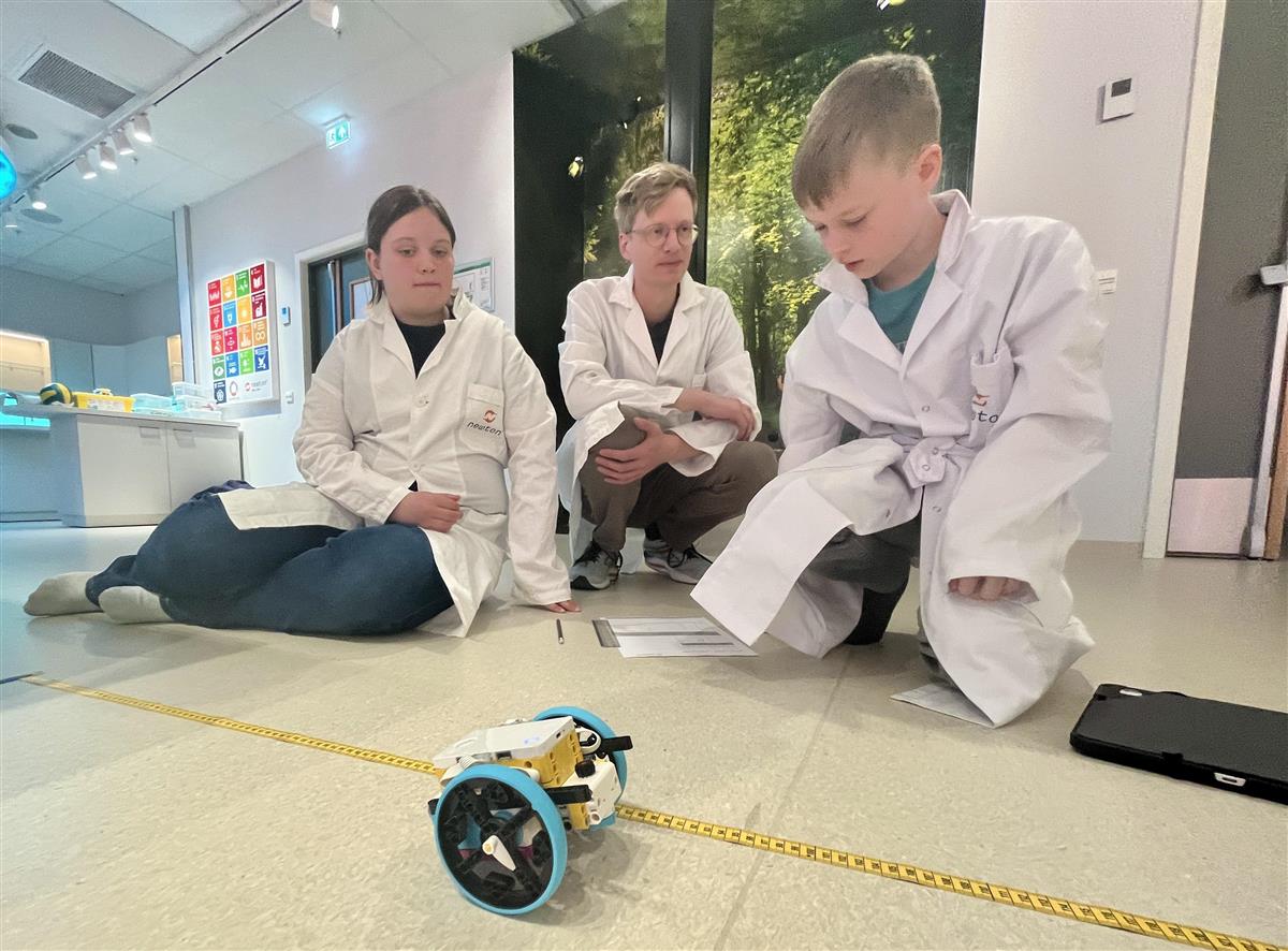 Om lag 20 elevar frå Hjørungavåg og Brandal skular fekk i førre veke teste Newton-konseptet i praksis. Sjetteklassingane jobba med legorobotar, der dei programmerte roboten til å køyre bestemte avstandar. Elevane målte omkrinsen på hjula, rekna ut kor langt roboten ville køyre ved tre, fire eller fem rotasjonar – og testa om utrekningane stemde i røynda.