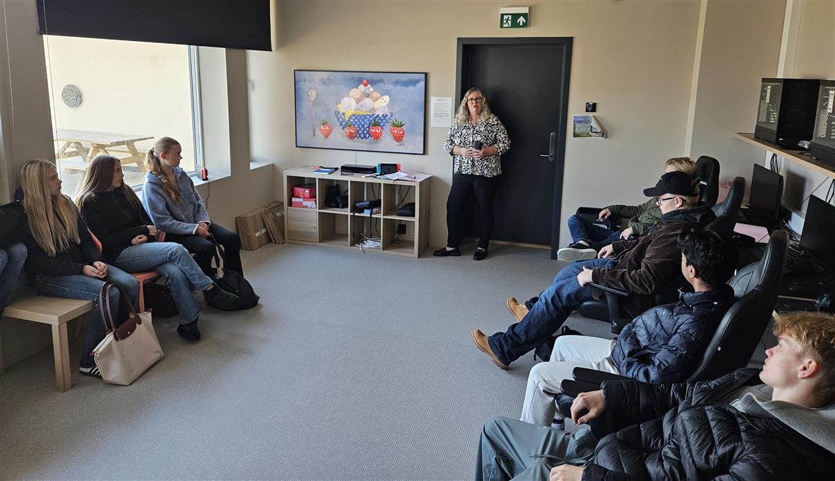 Kulturleiar Melinda Skeide i gamingroomet med ungdomsskuleelevane.