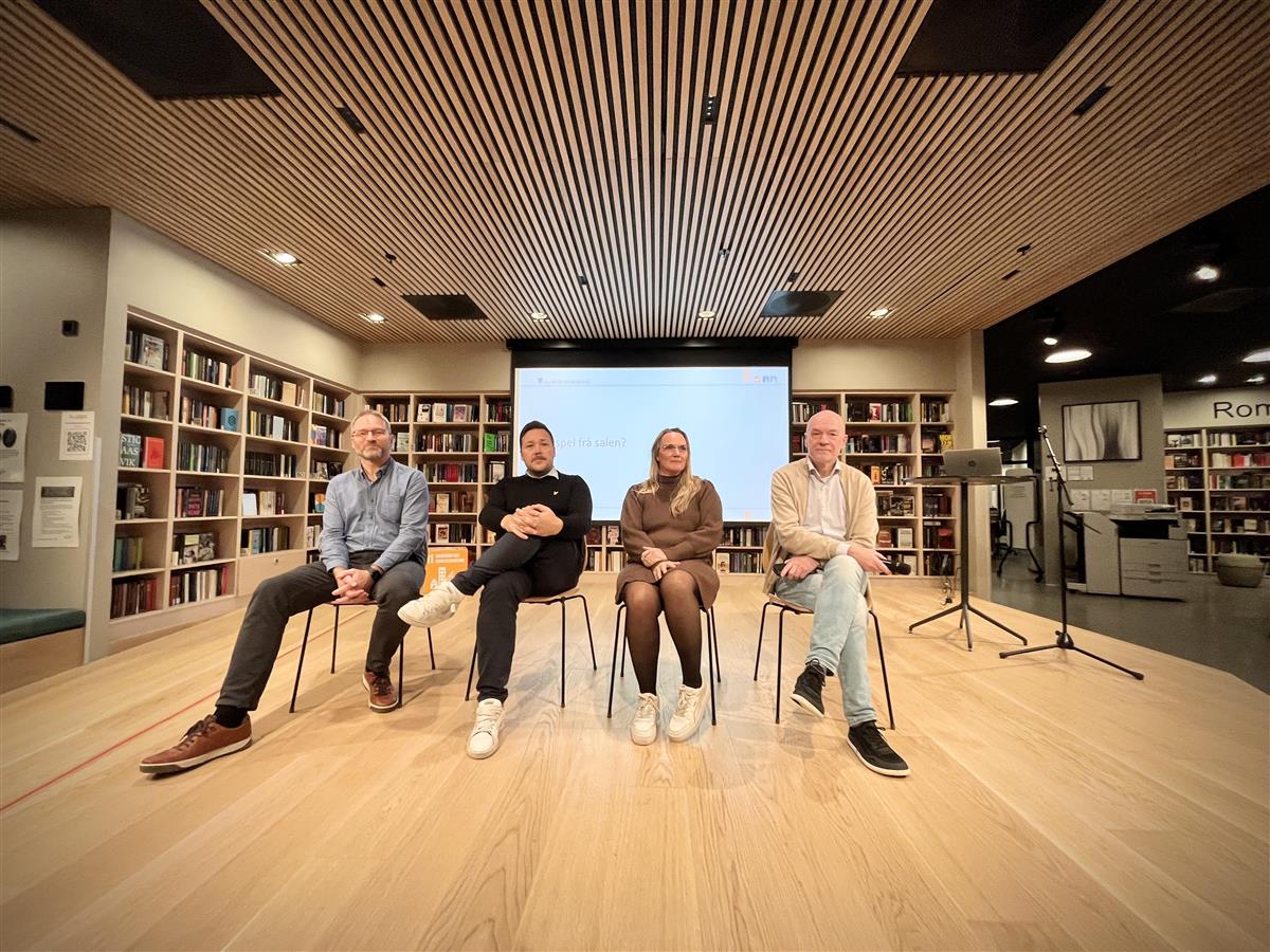 Dei fire kommunale leiarane sette seg klar på scenen for å ta imot spørsmål og innspel frå publikum. Frå venstre Helge Hamre, kommunalsjef i sektor for læring og kultur; Ottar Røyset, kommunalsjef i sektor for velferd; Hanne Rognan, assisterande kommunedirektør og Bent Arild Grytten kommunedirektør.